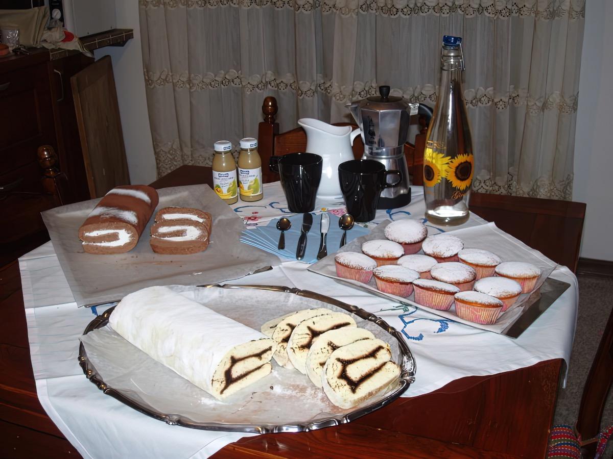 Various homemade pastries, coffee made with the Lavazza espresso machine "a modo mio," milk, tea, juices, yogurt, packaged pastries, crackers, packaged and homemade jams. Butter, various sugars, and sweeteners.